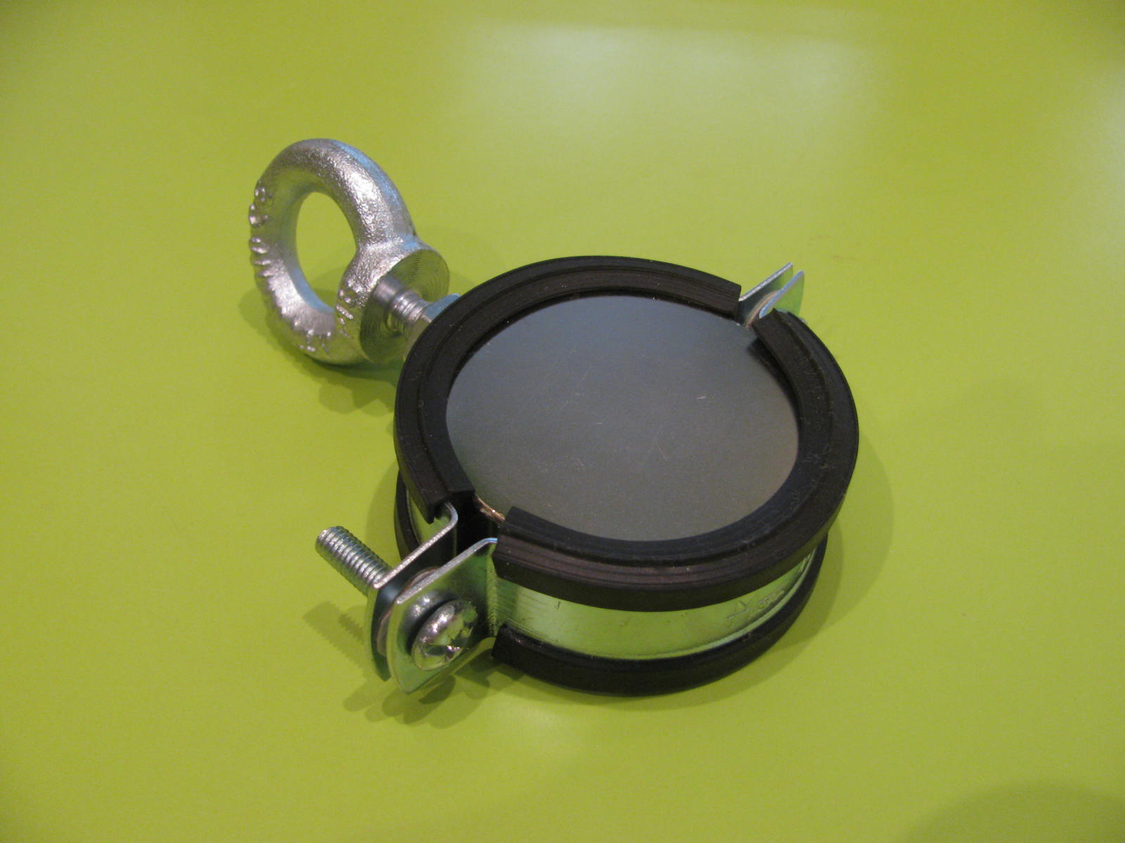 Одним з альтернатив, може бути магніт диск, який ми спостерігаємо на світлині. Магніт шайба 50х20мм, затиснутий двома сантехнічними хомутами. В цьому варіанті є як прив'язати мотузку і зберігаються властивості відкритого магнітного поля, що діють на значно більшу відстань, ніж у пошукових магнітів. Хоча сам металевий хомут частково і запобігає цьому. Також хомут може брати на себе удар, захищаючи таким чином сам магніт.
